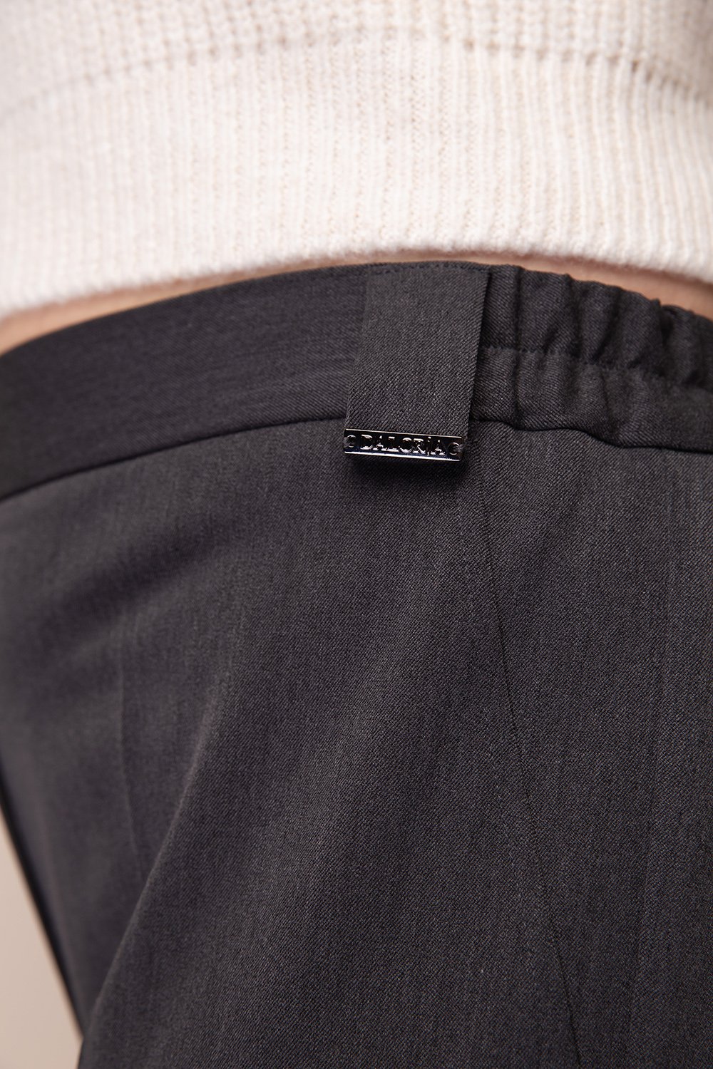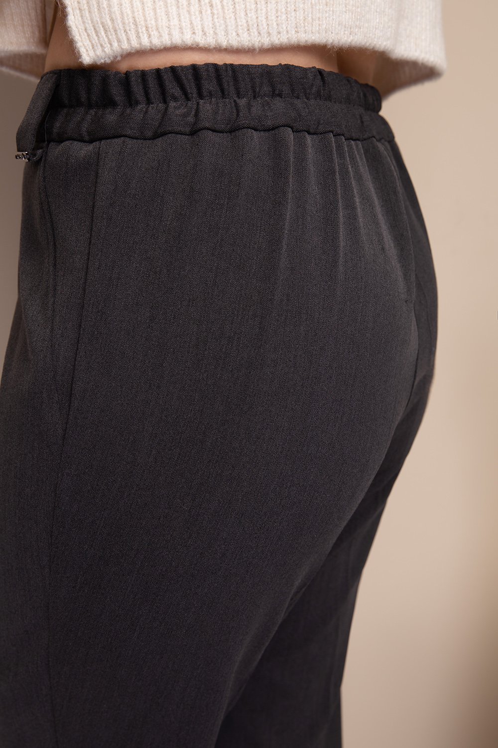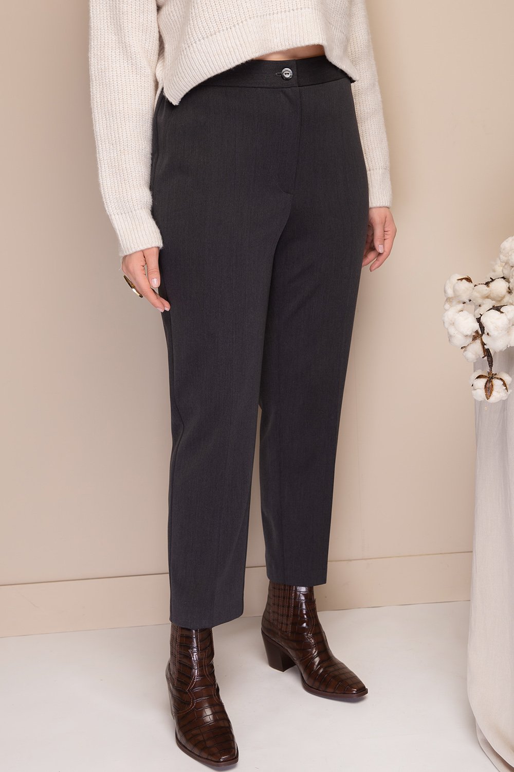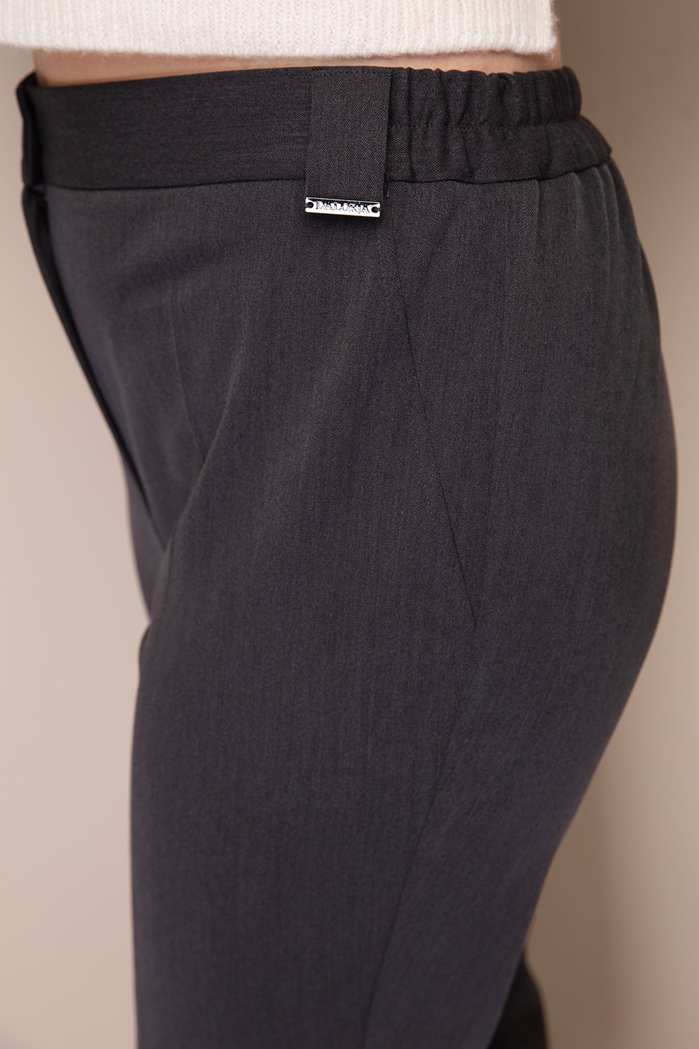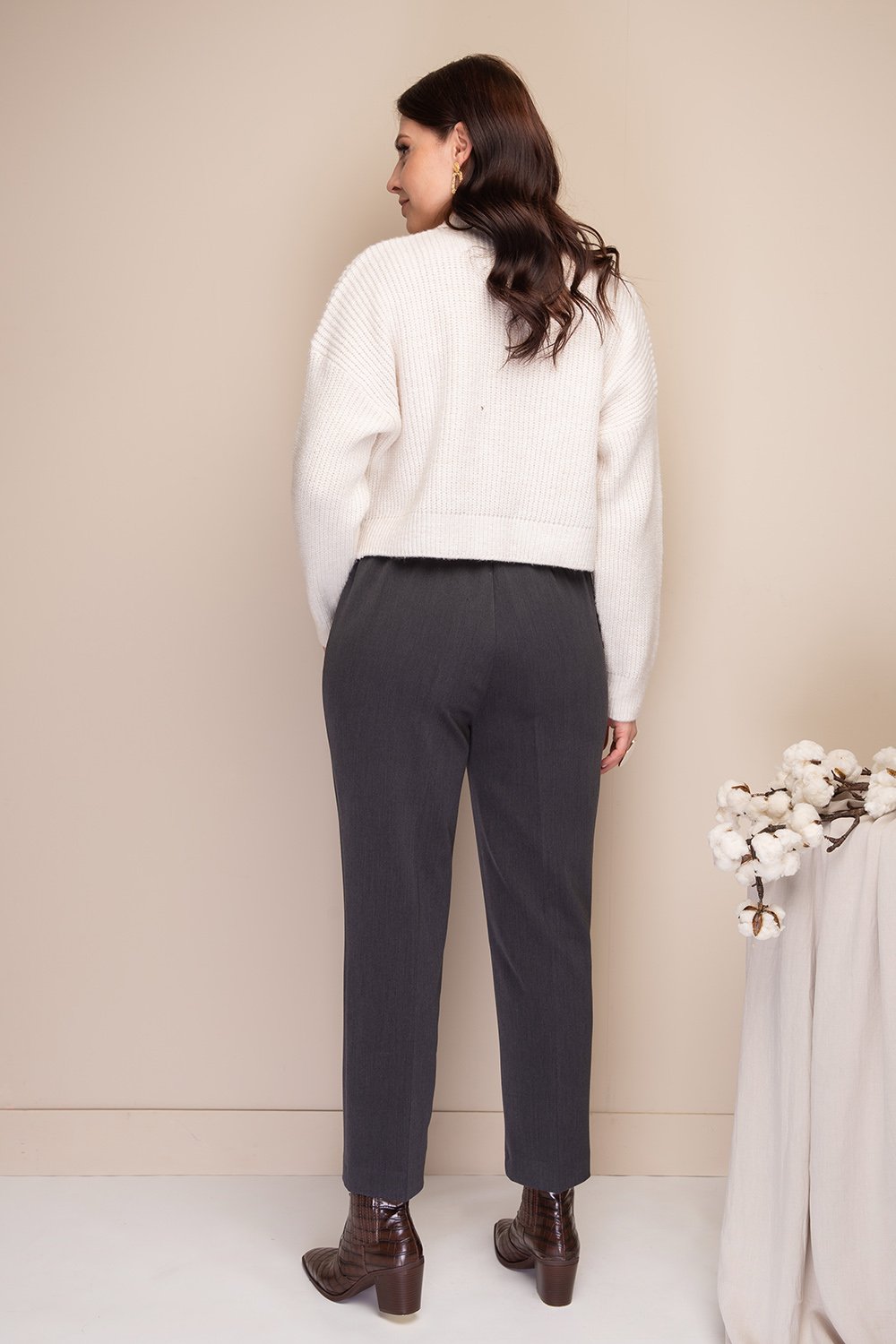 Брюки из мягкого плотного костюмного материала с небольшим содержанием эластана для удобной посадки. Брюки с застежкой на молнию и пуговицу, зауженного к низу силуэта, по спинке резинка в поясе. По переду и спинке заутюженные стрелки. Модель разработана для плюс сайз фигуры, скрывает недостатки и подходит для делового и спортивного стиля.
