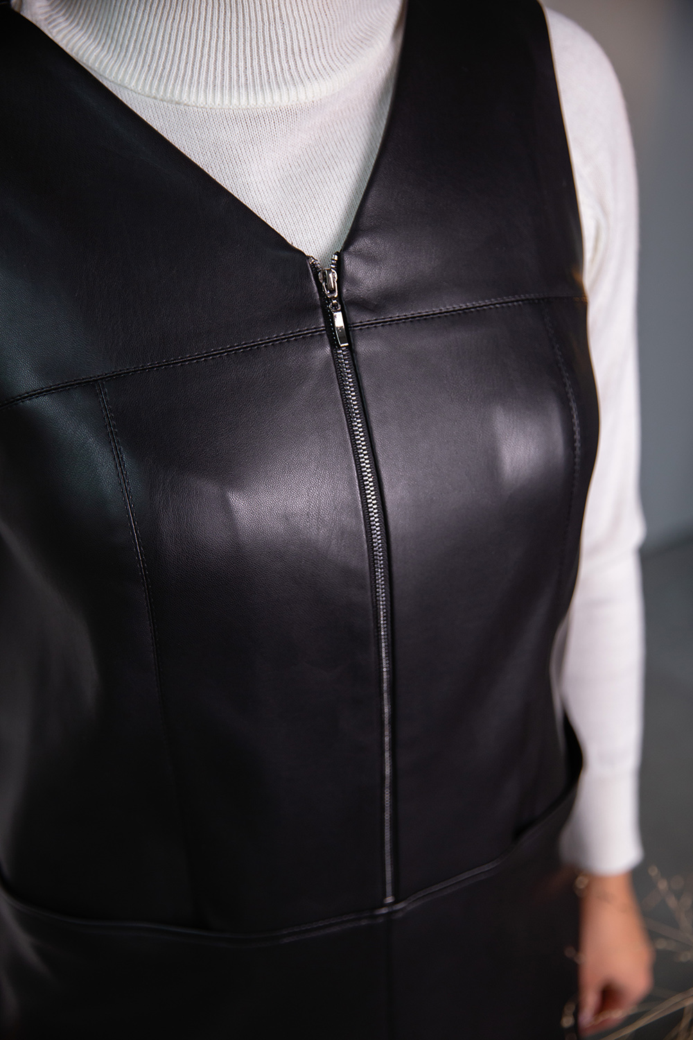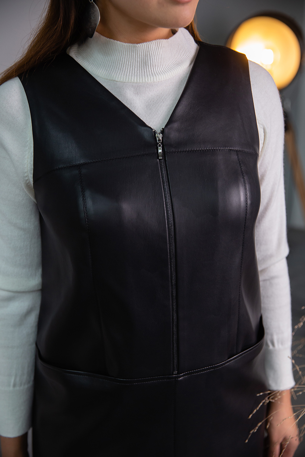 Сарафан из экокожи прямого силуэта на молнии. По переду - кокетка, рельефы и отрезная талия. По спинке - средний шов и рельефы. Длина сарафана - мини.