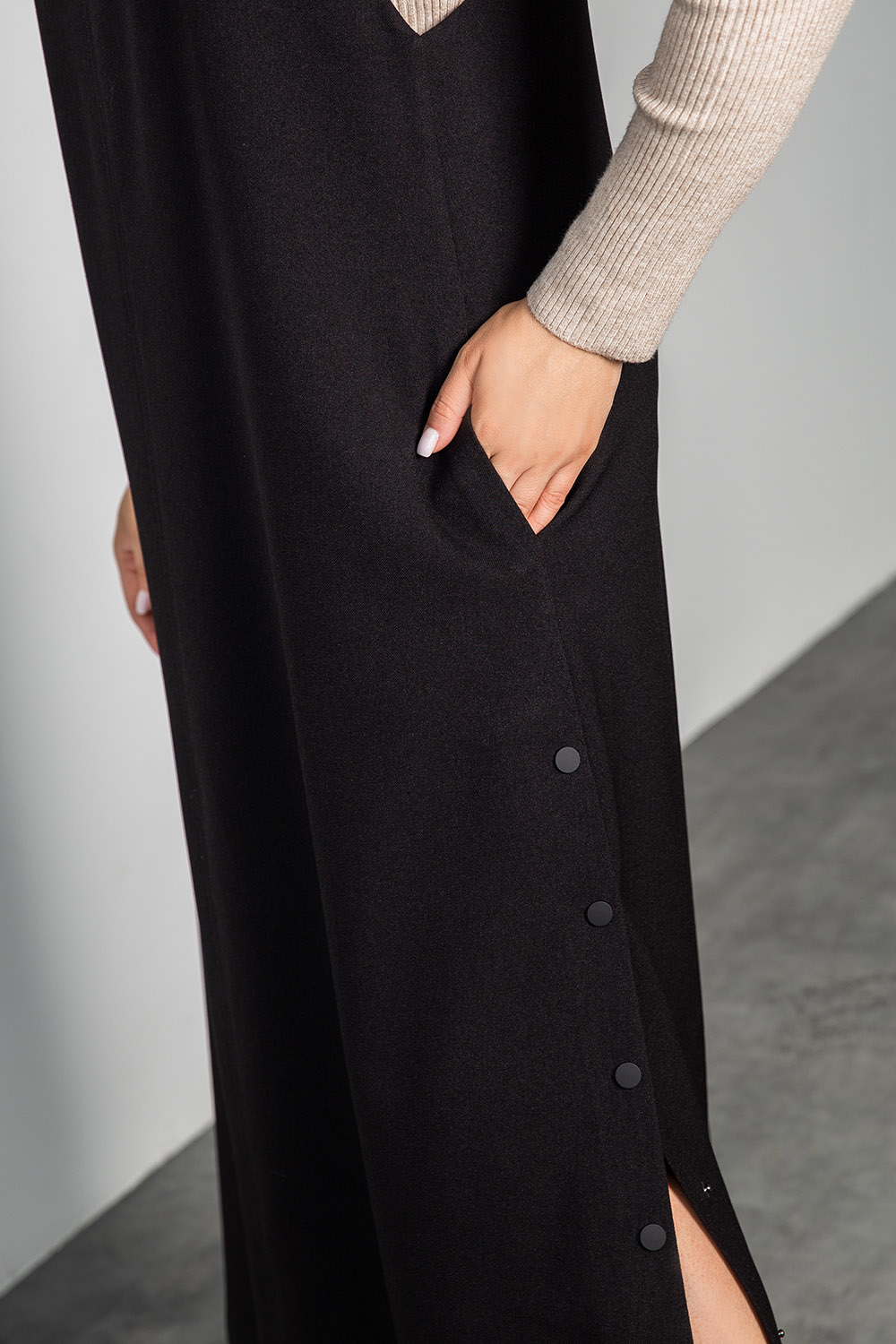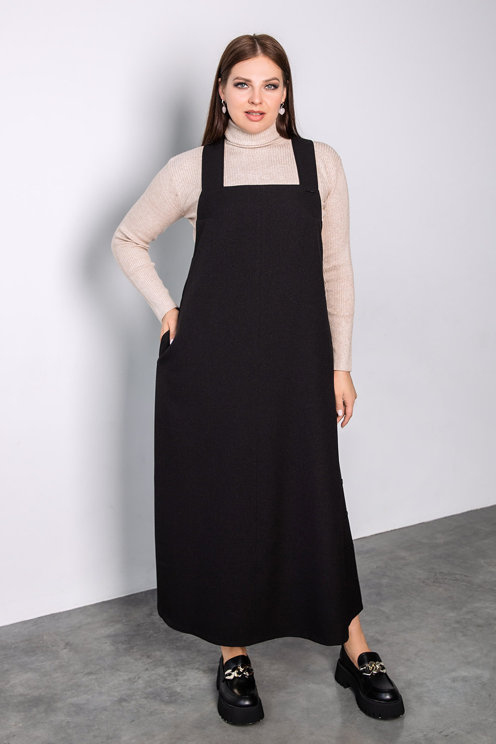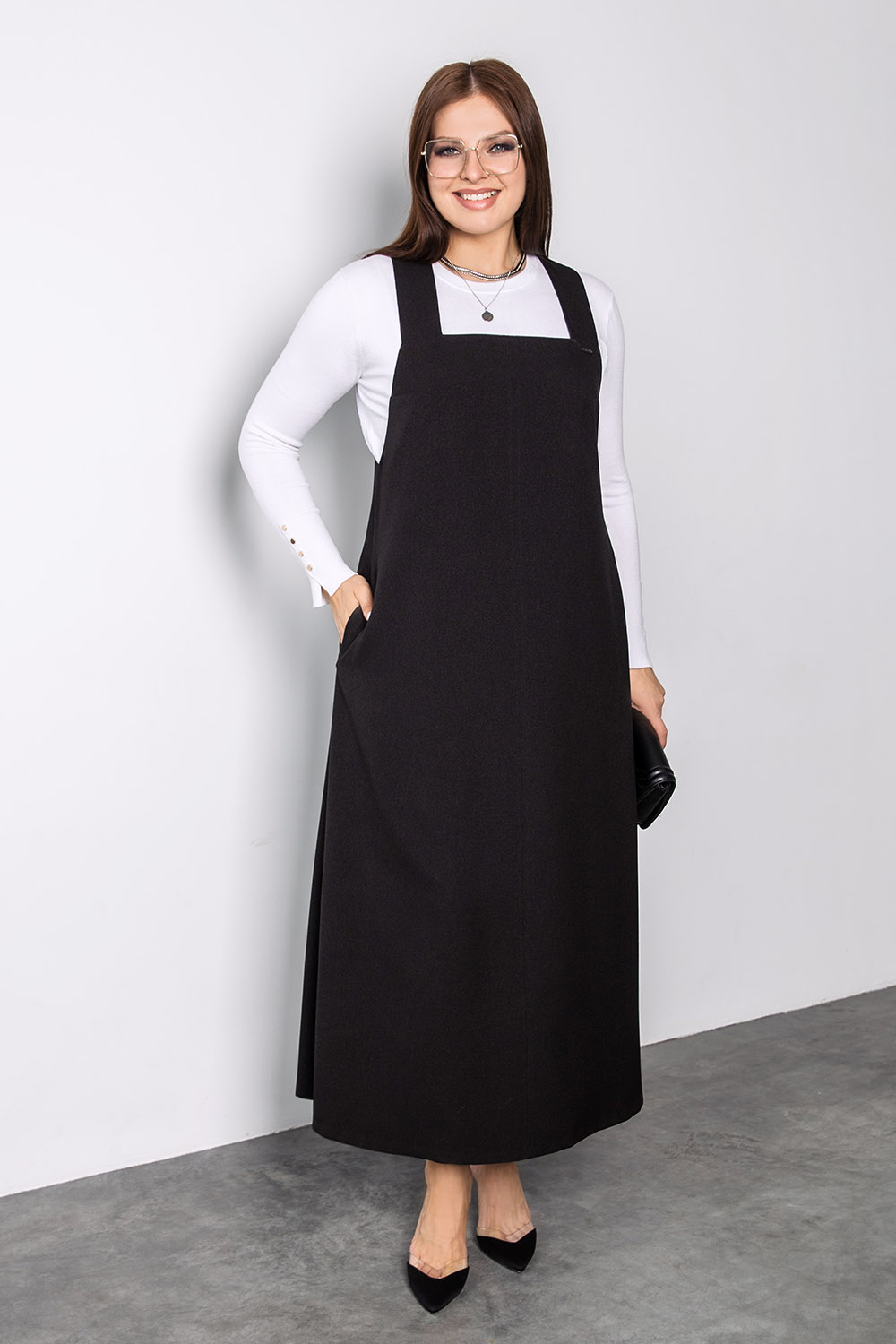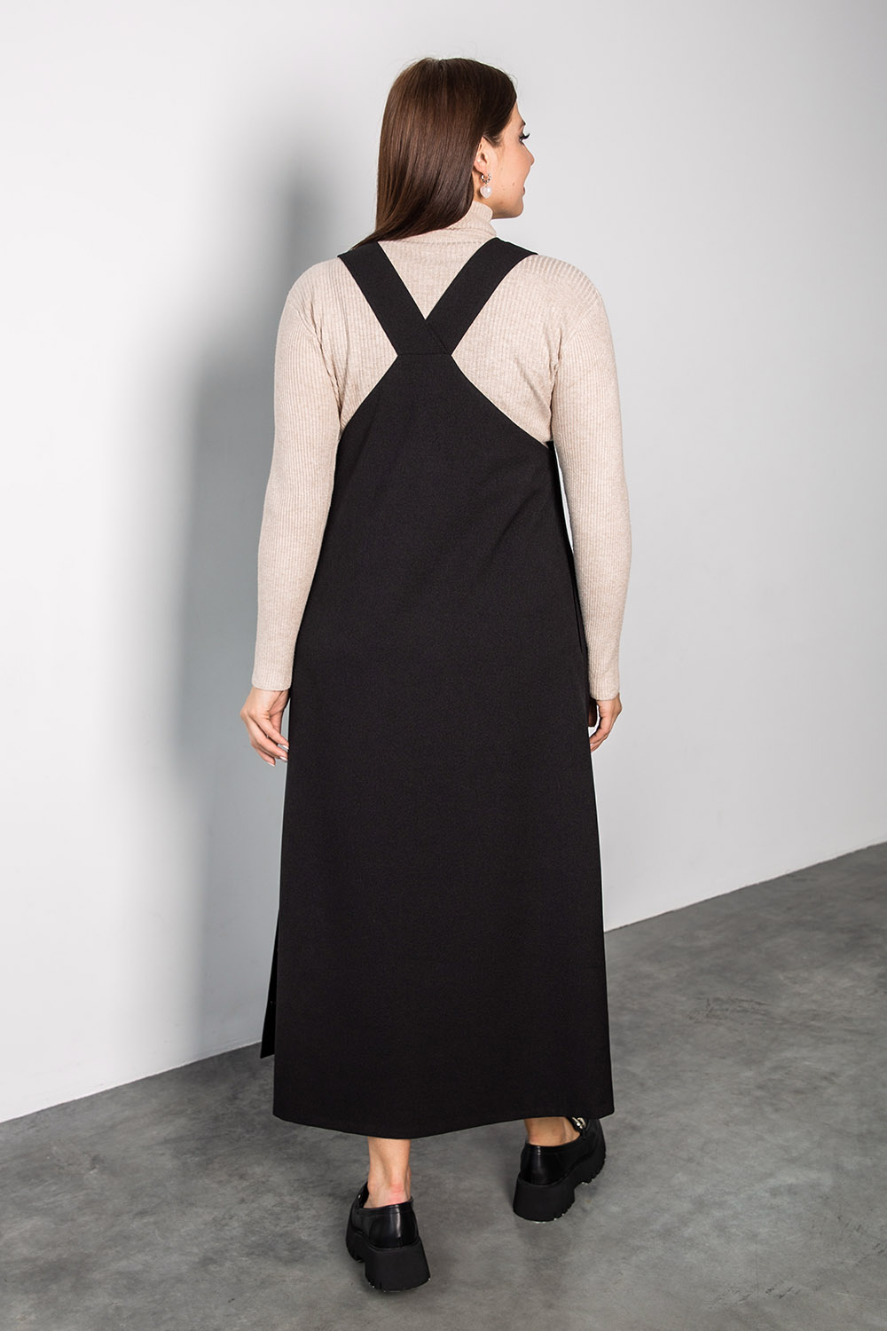 Сарафан-макси А-силуэта из трикотажа. Квадратный вырез горловины, широкие бретели. По переду - нагрудные вытачки и средний шов. Карманы в боковых швах. На спинке - V-образный вырез. Разрезы в боковых швах по низу изделия.