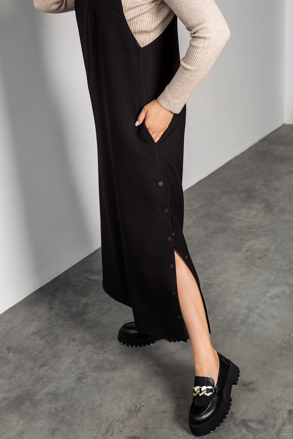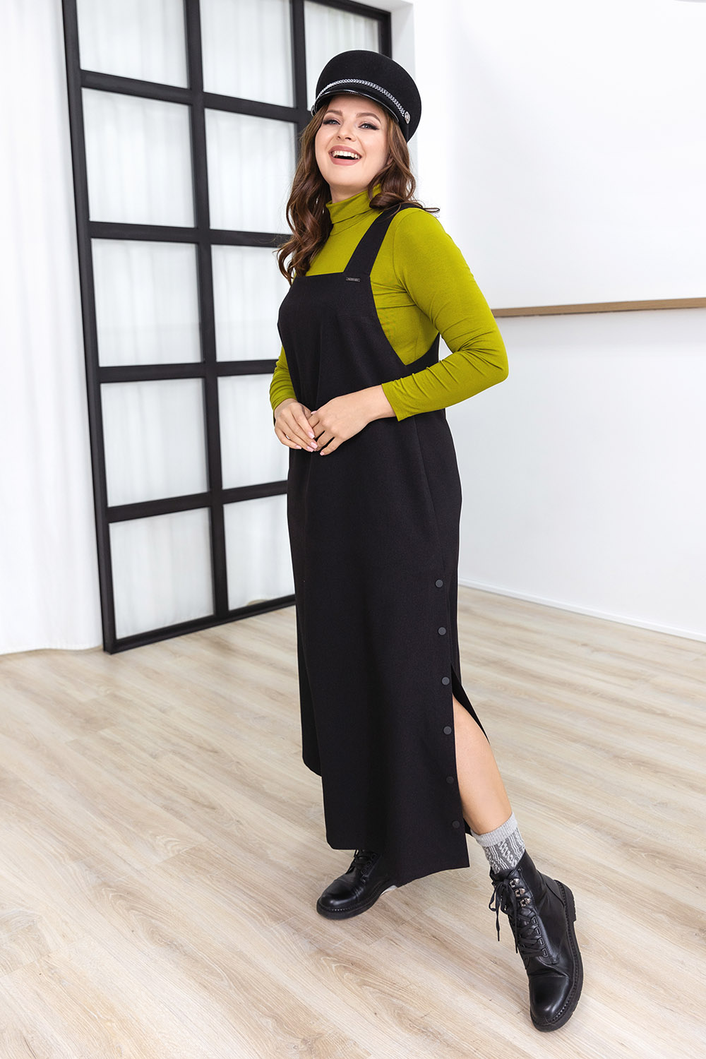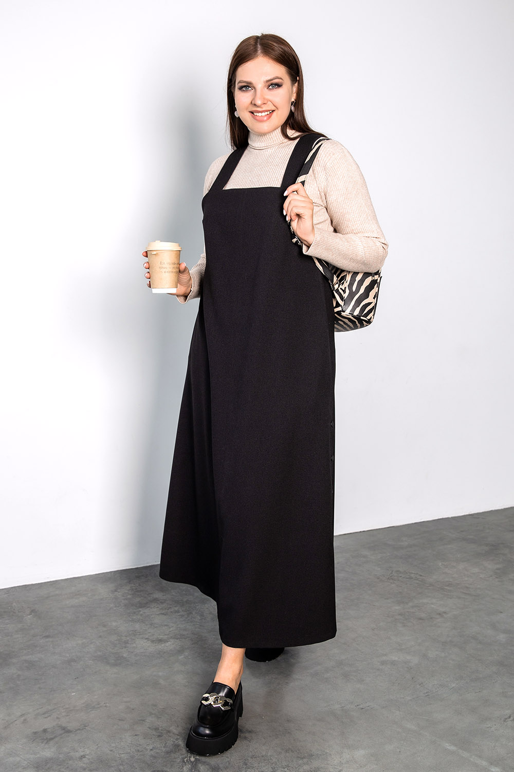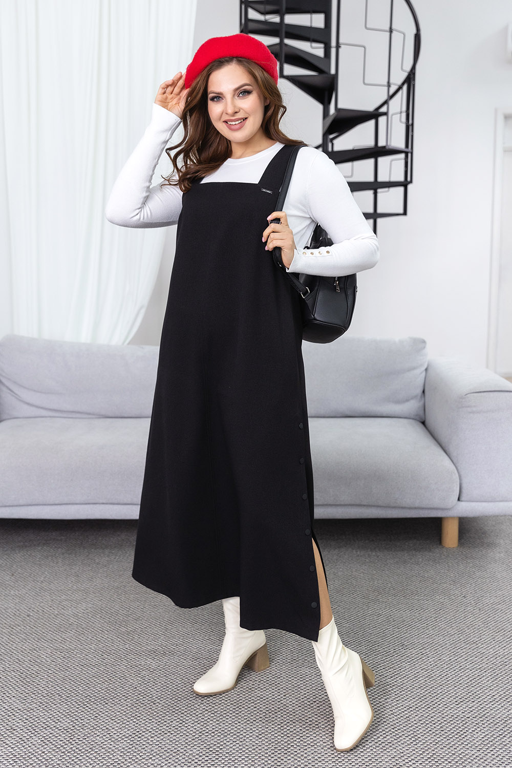 Сарафан-макси А-силуэта из трикотажа. Квадратный вырез горловины, широкие бретели. По переду - нагрудные вытачки и средний шов. Карманы в боковых швах. На спинке - V-образный вырез. Разрезы в боковых швах по низу изделия.