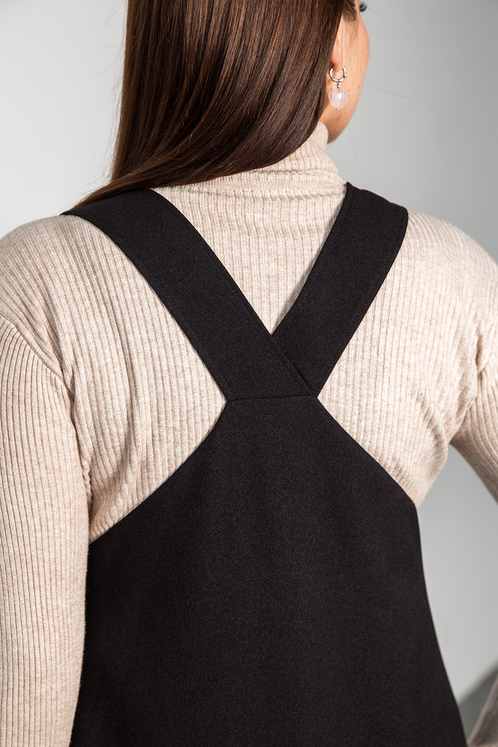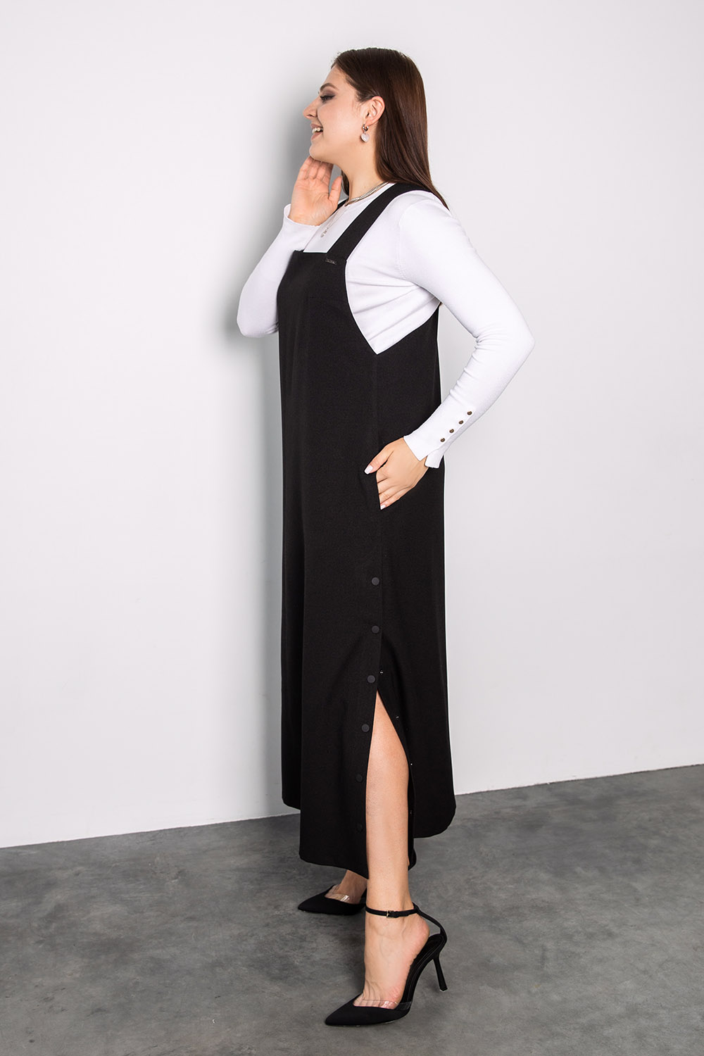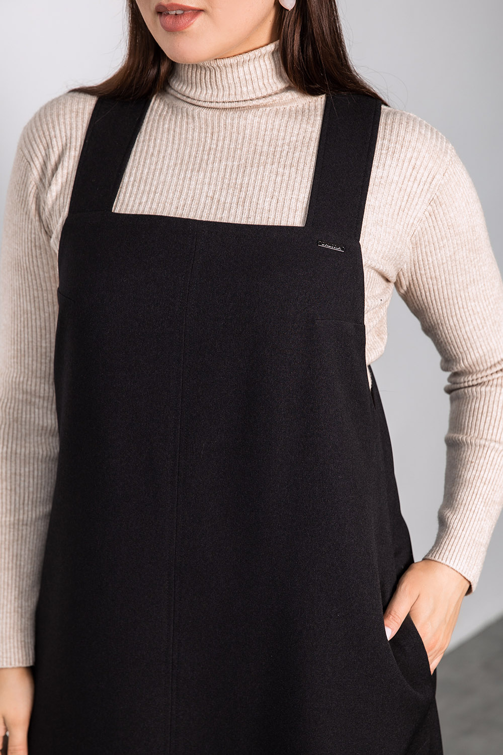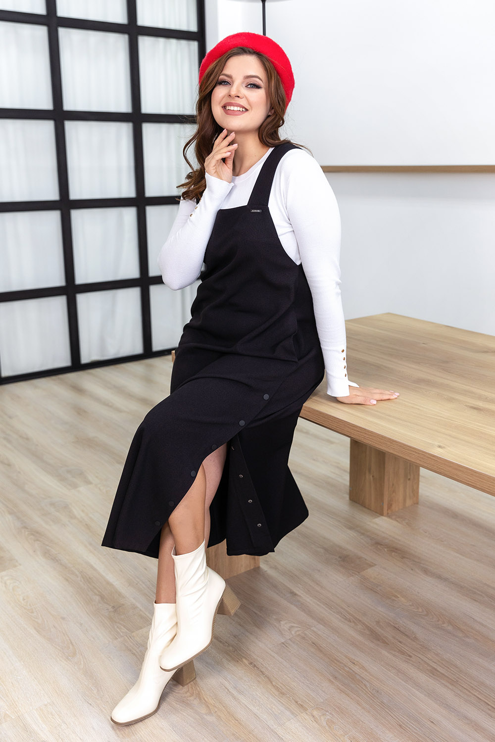 Сарафан-макси А-силуэта из трикотажа. Квадратный вырез горловины, широкие бретели. По переду - нагрудные вытачки и средний шов. Карманы в боковых швах. На спинке - V-образный вырез. Разрезы в боковых швах по низу изделия.